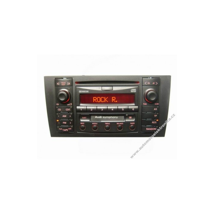 Použité autorádio Audi Symphony mgf + CD 4B0 035 195, RDS, 4x repro, komunikuje s přístrojovou deskou, CD měničem a ovládáním na volantu, červené podsvícení tlačítek, bez mechanického poškození a plně funkční, kód je samozřejmostí